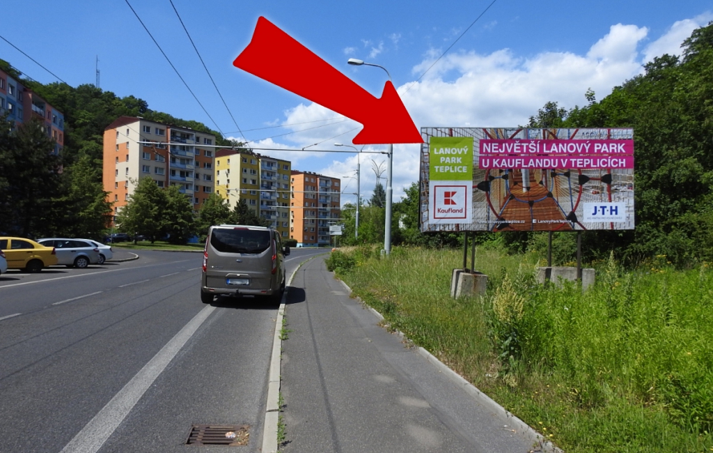 Oboustranné euroboardy v Proseticích - okrajová čtvrť Teplic u velkého panelového sídliště Prosetice, frekventovaný provoz ve směru od Bystřan a okolních vesnic (Rtyně, Velvěty, Úpořiny,..). Spousta tepličáků používá Pražskou jako tah od Prahyz D8.