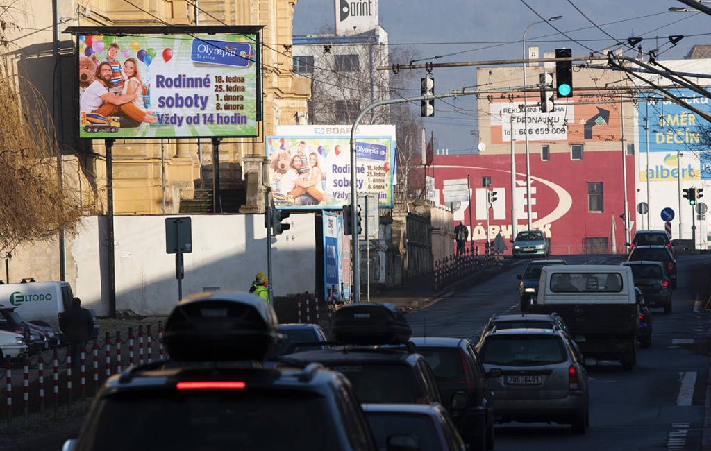 LED billboard v centru Teplic v Alejní ulici - křižovatka s vjezdem na Náměstí Svobody. Příjezd ke OC Galerie a OC Fontána.