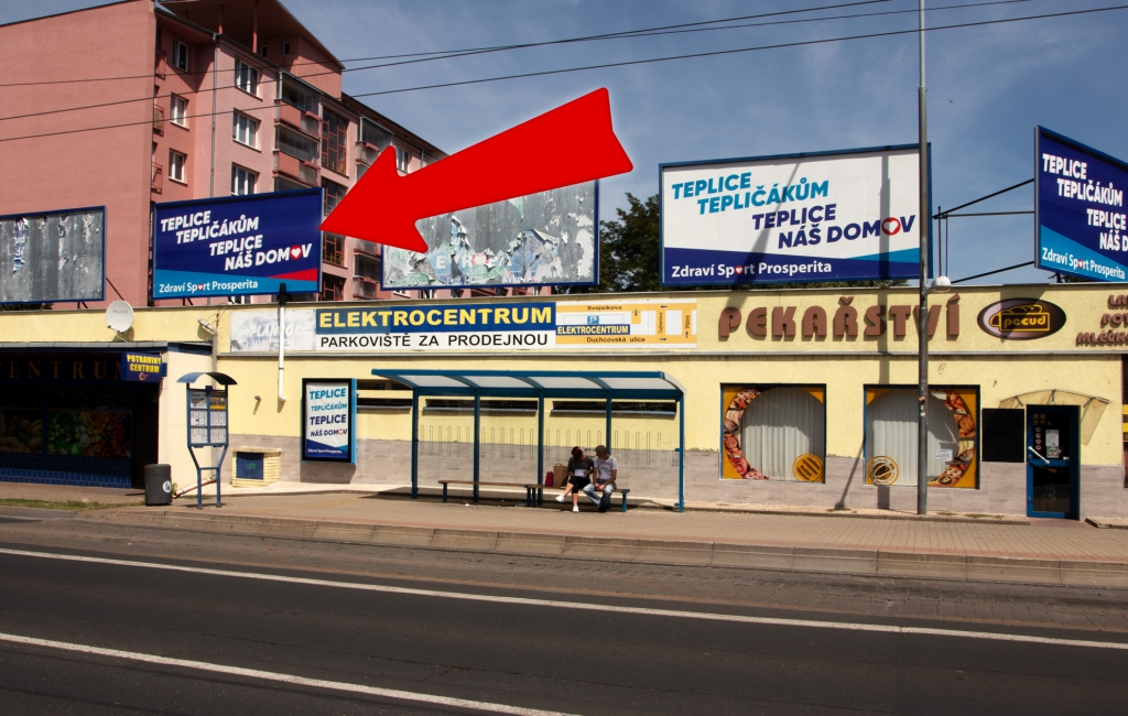 Euroboard v ulici Duchcovská, přímo naproti vchodu do Okresní nemocnice s poliklinikou Teplice. V blízkosti MHD zastávky